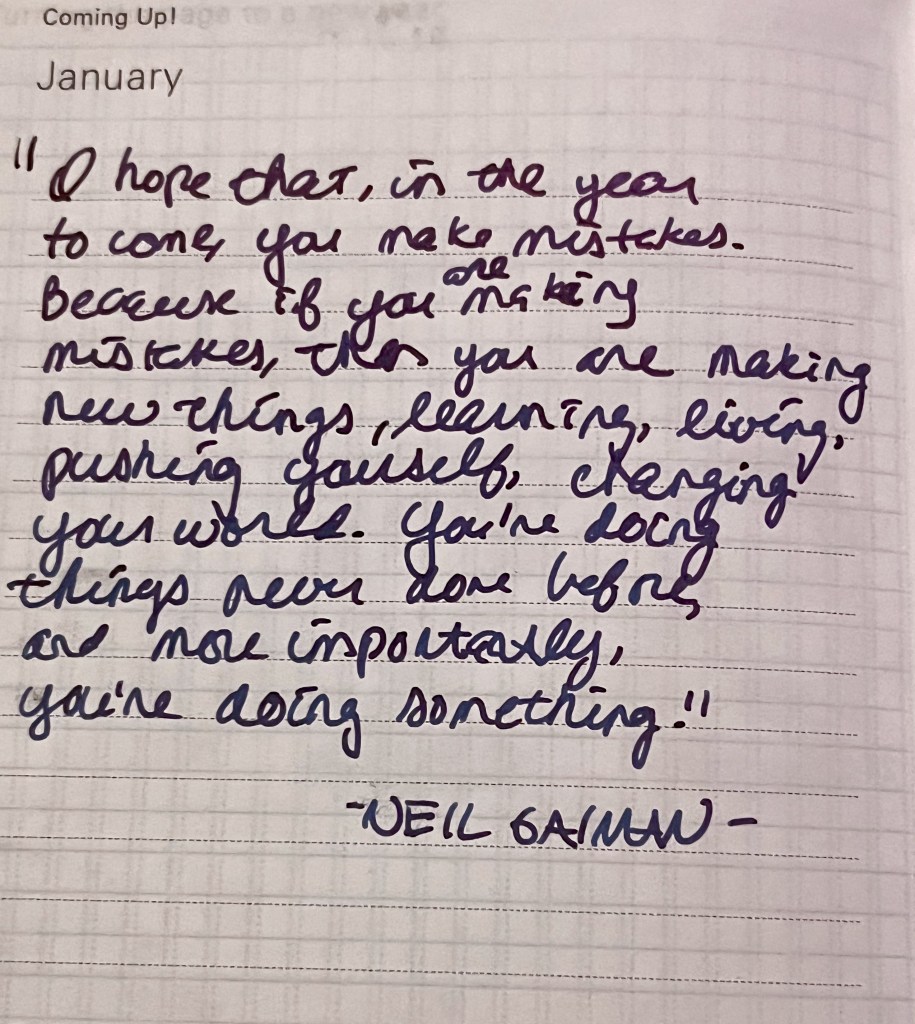 So that’s my wish for you, and all of us, and my wish for myself. Make New Mistakes. Make glorious, amazing mistakes. Make mistakes nobody’s ever made before. Don’t freeze, don’t stop, don’t worry that it isn’t good enough, or it isn’t perfect, whatever it is: art, or love, or work or family or life.